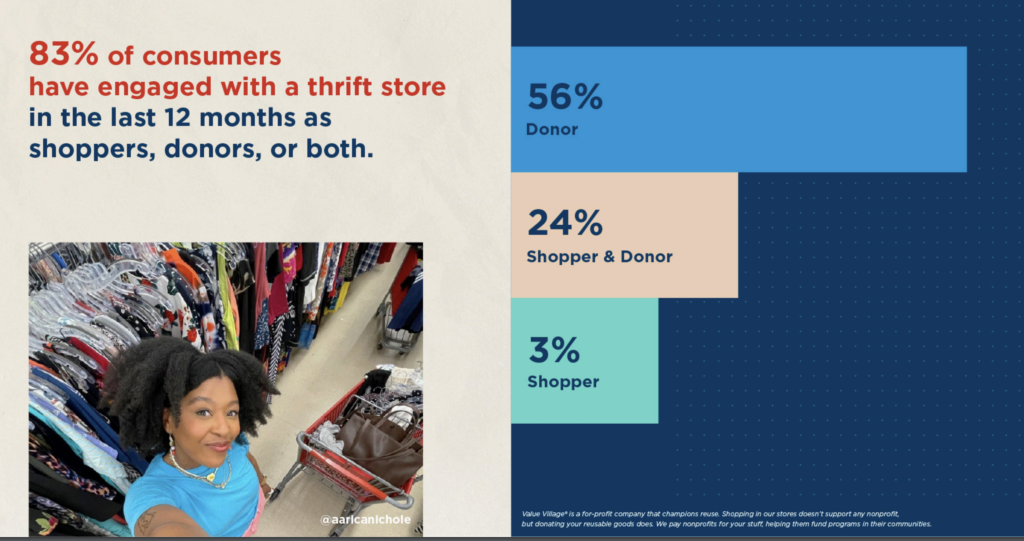According to a report by Value Village, 90 per cent of Canadian consumers have engaged with a thrift store— shopping, donating, or both—an increase from 83 per cent in 2022. There is also noteworthy that 40 per cent of Value Village customers are GenZ, with 60 per cent of this group have quarter of their wardrobe filled with secondhand clothes.